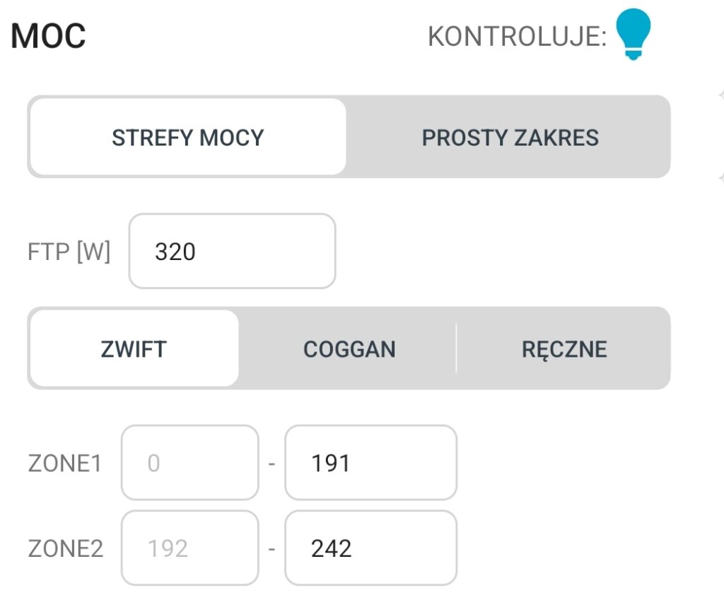 Kolejny raz pochwalę twórcę, bo aplikacja jest bardzo, ale to bardzo intuicyjna. Działa niemalże jak TrainingPeaks. Możesz wpisać swoje FTP, a apka sama podzieli strefy mocy i automatycznie dobierze do nich kolory. Można też wybrać gotowe kolory ZWIFT’a. Ja takie wybrałem. Mamy jednak do dyspozycji całą paletę barw, które możemy wybrać w zależności od strefy mocy. Pełne ustawienie wszystkich parametrów zajęło mi około 30 sekund. Spodziewałem się, że spędzę tak cały trening, a tu miłe zaskoczenie.