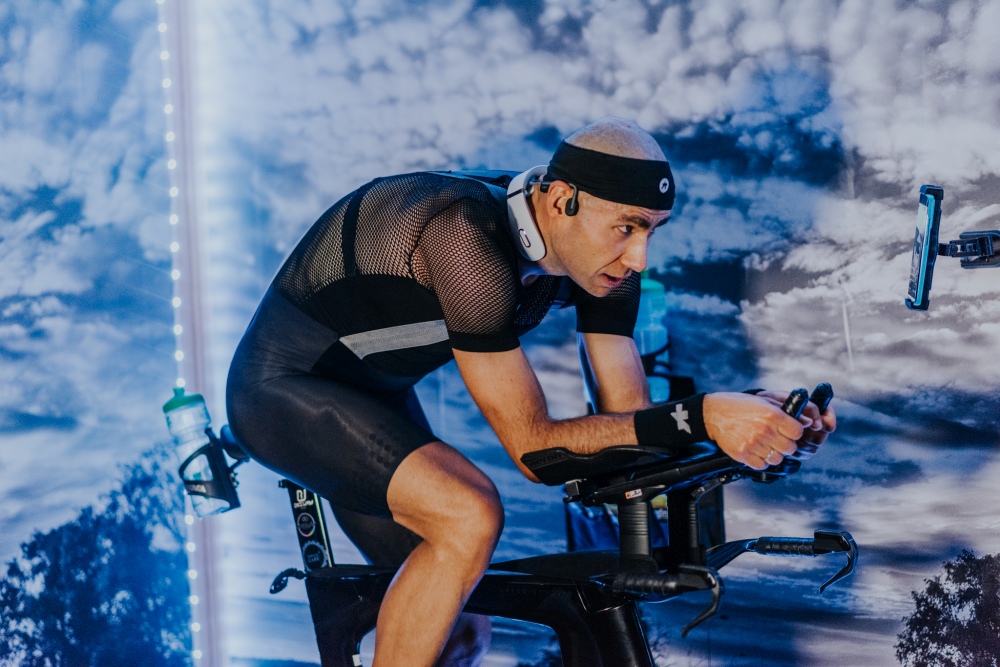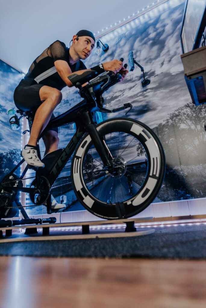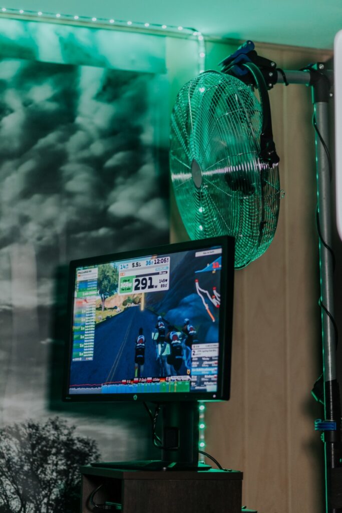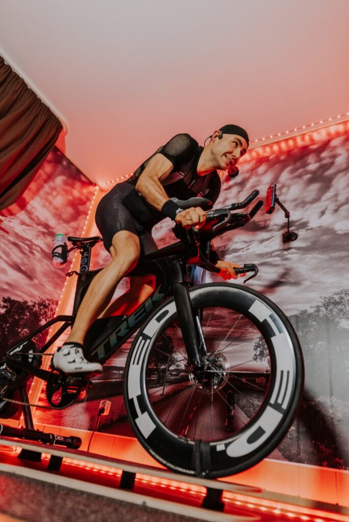 Fajnie jest trenować w swojej własnej przestrzeni, w której czujesz się komfortowo. Mi tak naprawdę dzięki temu, z dużą łatwością przychodzą wielogodzinne treningi na ZWIFT. Rok temu bardziej męczyłem się psychicznie, szczególnie jak np. moja Natalia kilka razy przechodziła między mną, a telewizorem. To trochę tak jakby mieć swoje biuro na korytarzu. Nie możesz się skoncentrować i każdy co chwilę Cię rozprasza. A jeśli znajdziesz sobie jakiś włąsny kąt, dodasz do tego matę, platformę, ekran i fajne głośniki wraz z lampkami, robi się naprawdę przyjemnie.