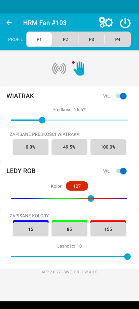 Do wyboru mamy 4 tryby – P1, P2, P3, P4. Ta sama zasada działania jak w HRM FAN, więc jeśli posiadasz już to urządzenie, to już nic nie powinno Cię zaskoczyć. W każdym trybie za pomocą ikonki „dłoni” możesz sterować ręcznie kolorem LED’ów. To dobra opcja np. dla influencer’ów, którzy celują w niepowtarzalne zdjęcie.