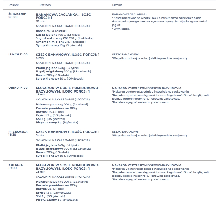 Mam dla Was przykład protokołu ładowania węglowodanów jednego z moich zawodników. Powinien on być dopasowany do możliwości, preferencji i wagi, a więc nie jest przeznaczony dla każdej osoby. Daje jednak pewien podgląd na to, jakie dania możemy wykorzystać. Smacznego i powodzenia!