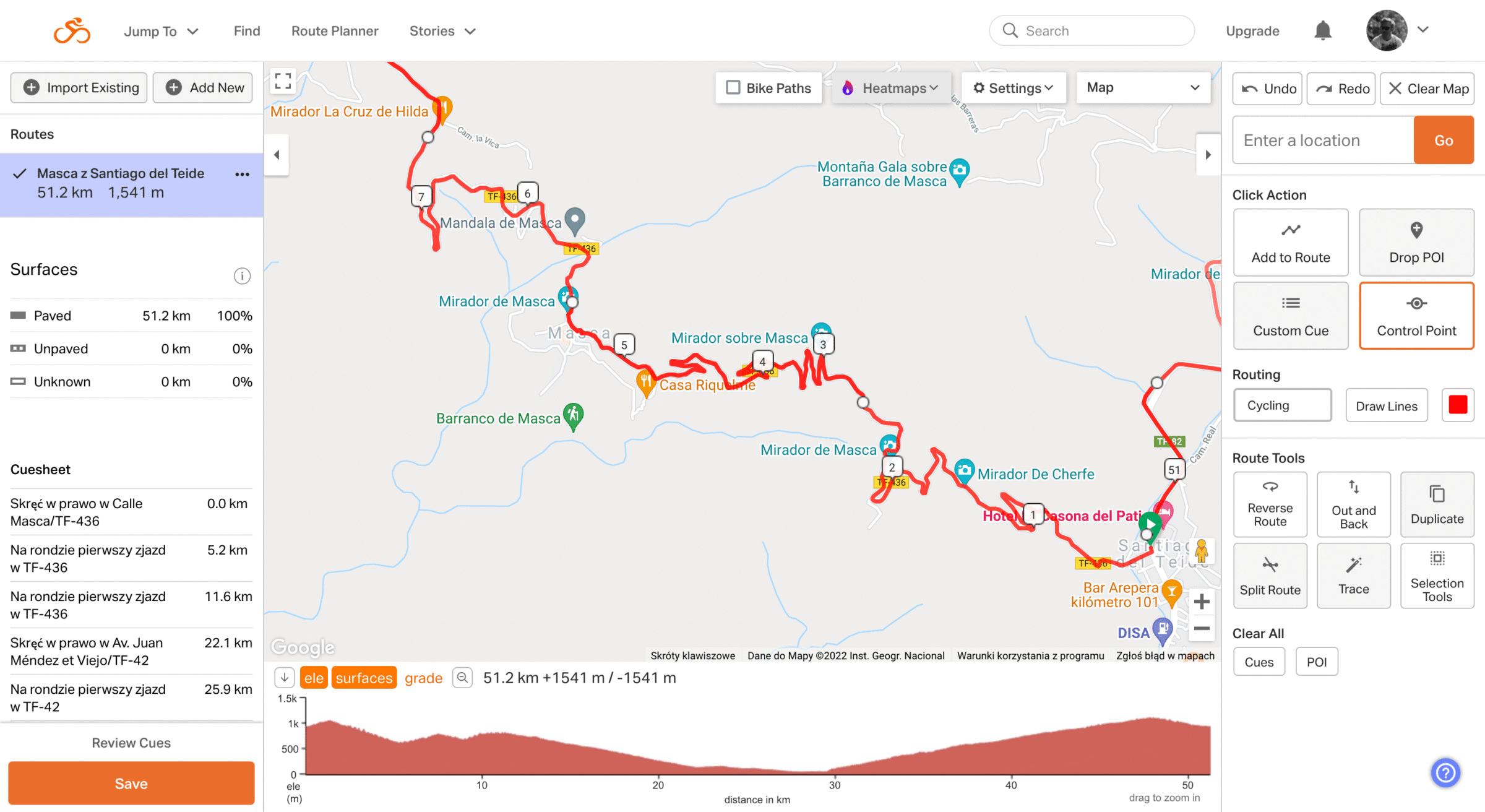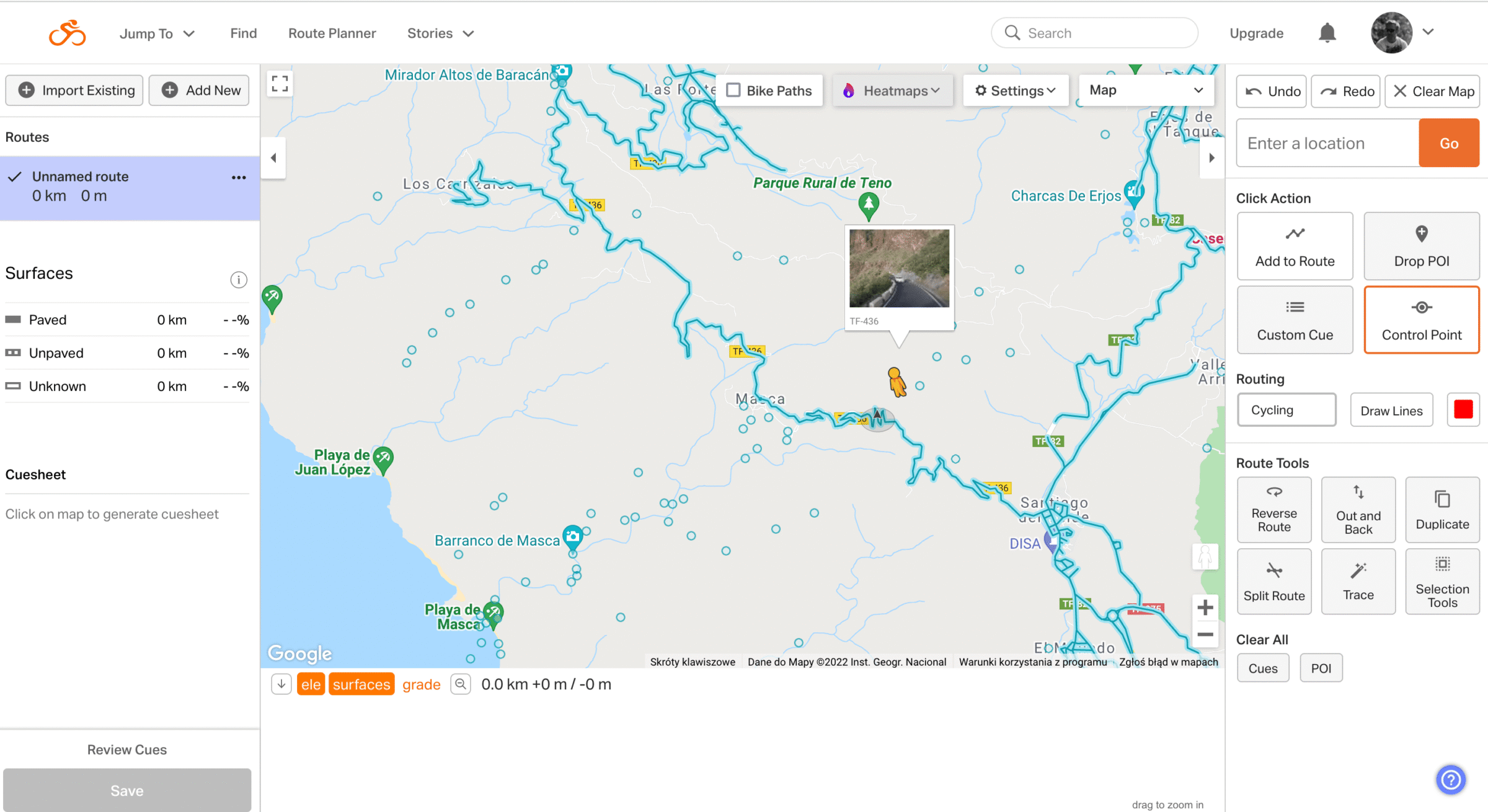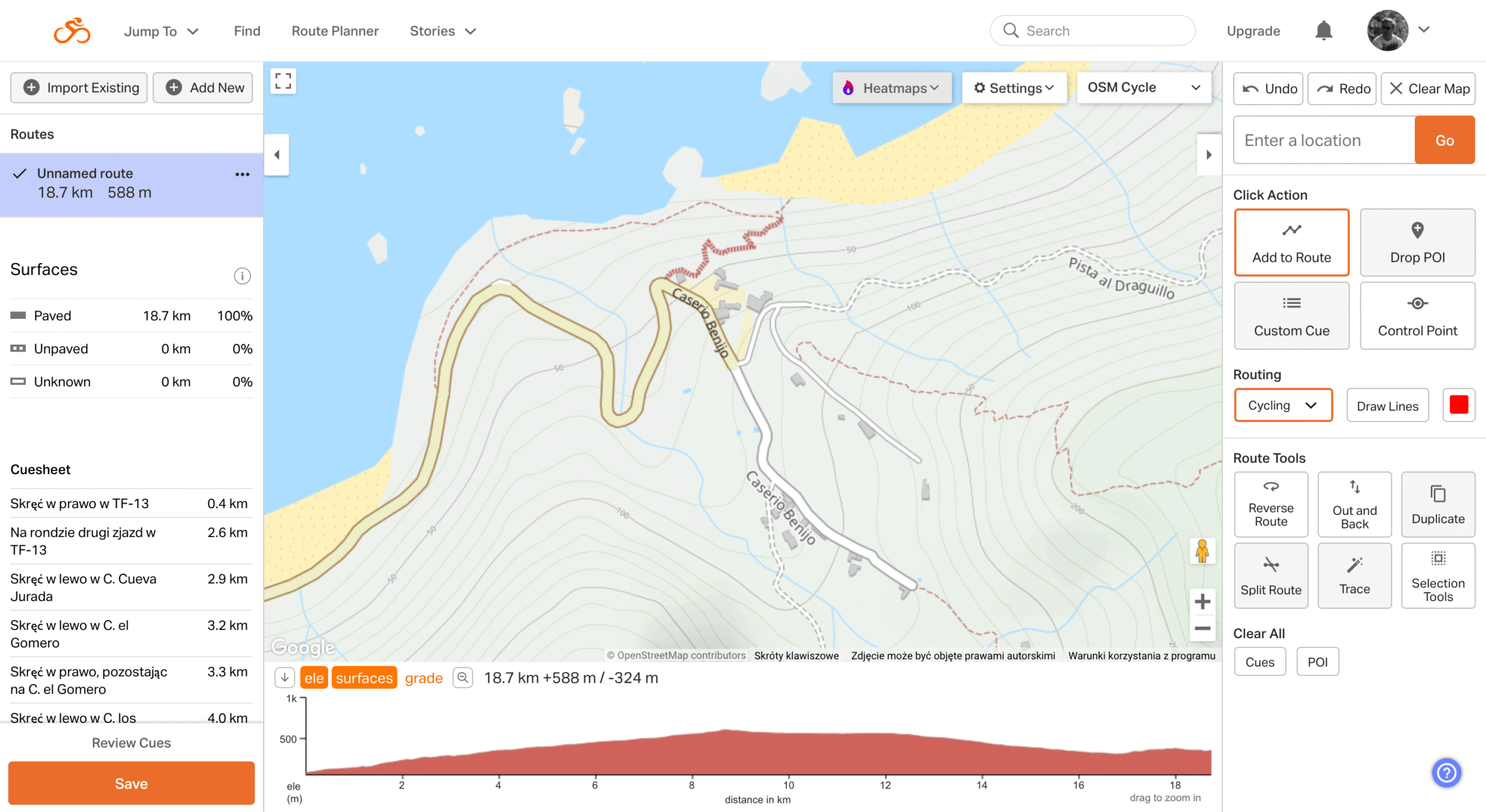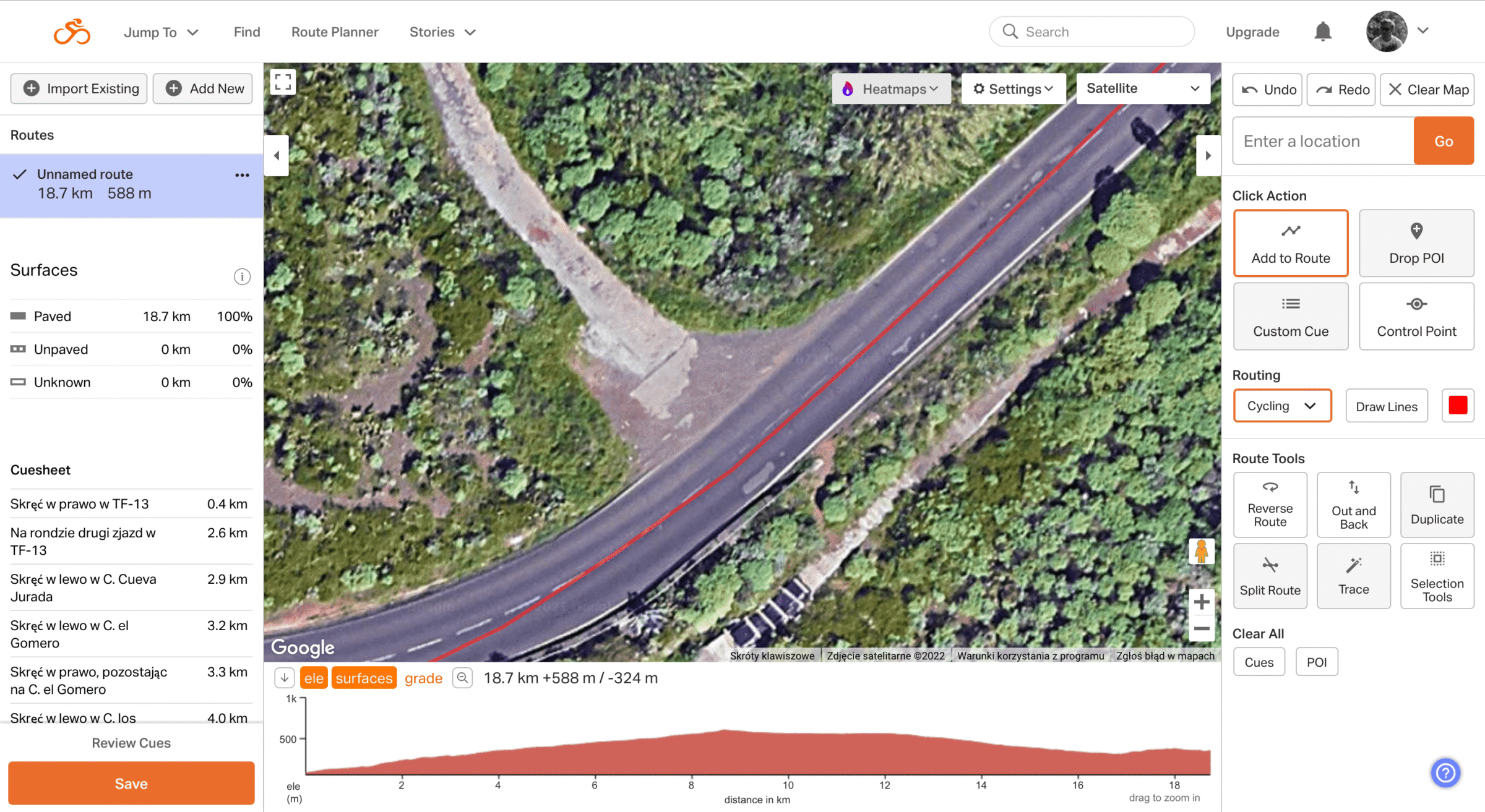 W ostatnim czasie do programu została dodana nowa funkcjonalność – rozpoznawanie nawierzchni. Kiedy rysujemy trasę, czerwona linia oznaczająca ślad jest ciągła, jeśli prowadzi asfaltem, a staje się przerywana, gdy z niego zbacza. Dodatkowo, w lewym bocznym menu można znaleźć informację o nawierzchni (Paved, Unpaved, Unknown).