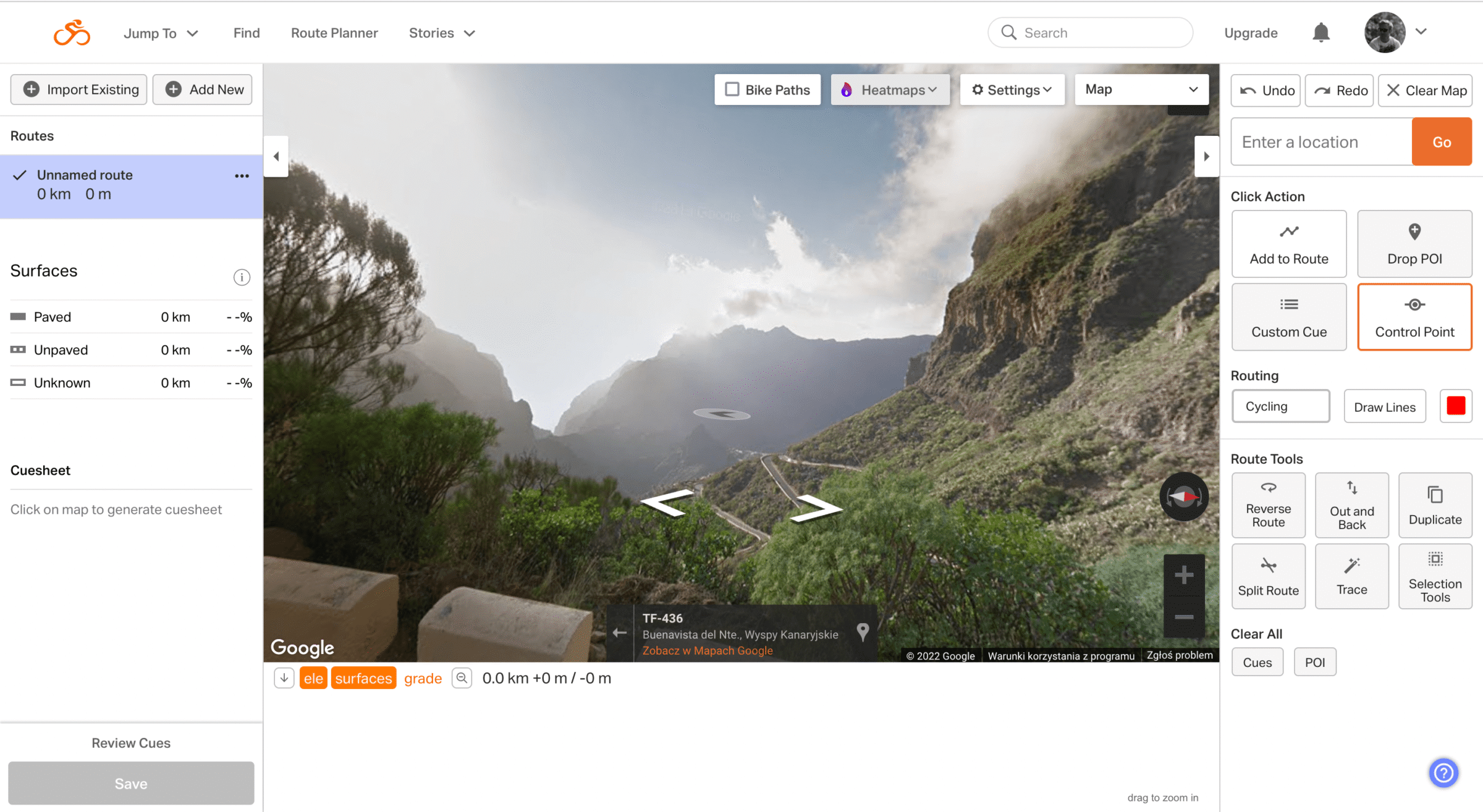 Ja jednak w te dane nie do końca wierzę. Zwykle mój pierwszy ruch to kliknięcie w ludzika Street View i przeciągniecie go w interesujący mnie punkt. Jeśli dany teren ma pokrycie fotograficzne to ok, wytyczam dalej. Przy okazji warto też sprawdzić czy wybrana trasa prowadzi przez ciekawe otoczenie, jeśli nie, można poszukać jakiejś alternatywy.