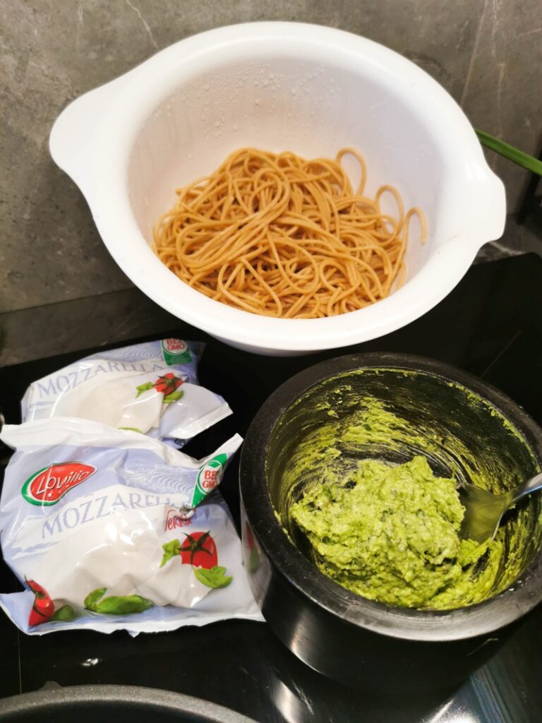 Bardzo ważne jest aby każdy posiłek, który spożywamy w ciągu dnia był zbilansowany. Zawierał pełnowartościowe źródła trzech głównych składników: białka, węglowodanów i tłuszczy, z obfitą porcją warzyw. Gwarantuje to brak niedoborów i odpowiednie odżywienie naszego organizmu. W dzisiejszej propozycji za białko będzie odpowiedzialna mozzarella, za źródło węglowodanów makaron, a za źródło tłuszczu pesto na bazie oliwy.