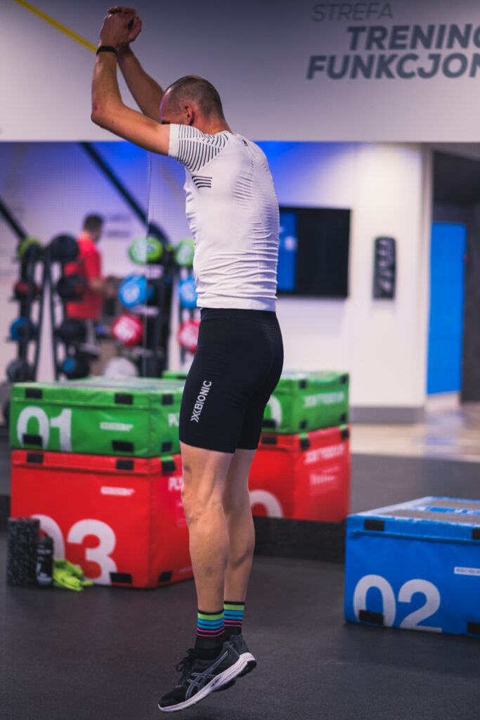 - Dynamiczne wyskoki z wybicia obunóż, gdzie pozycją wyjściową jest półprzysiad. Powtarzamy to w kilku intensywnych seriach po 10 razy.