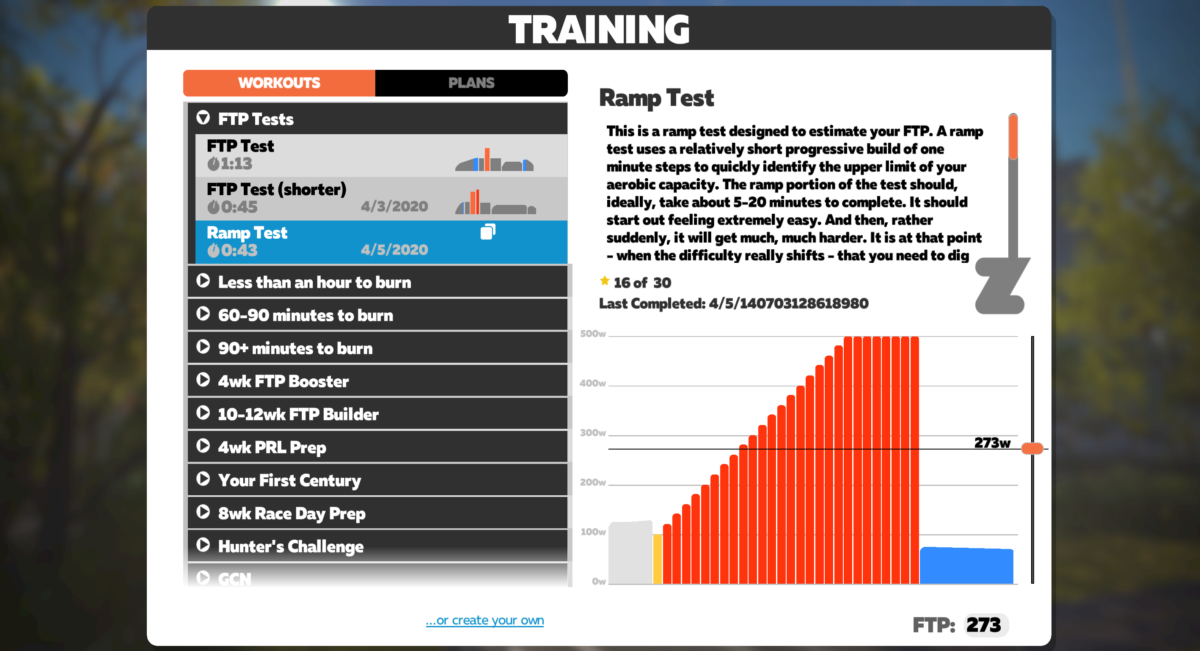 W dobie trenażerów „smart” (choć nie są do wykonania tego testu konieczne) coraz większą popularność zdobywa test rampowy. Jest to banalnie proste rozwiązanie przypominające przebiegiem badanie wydolnościowe w laboratorium diagnostycznym. Test rampowy można wykonać za pośrednictwem platform takich jak Trainer Road czy Zwift używając protokołu ERG (trening steruje obciążeniem trenażera).