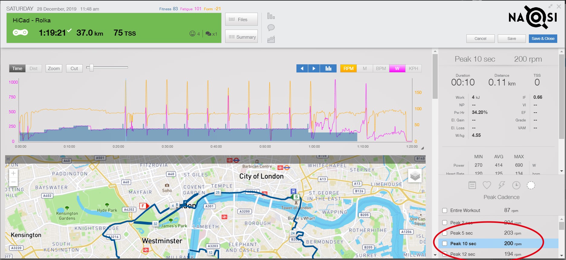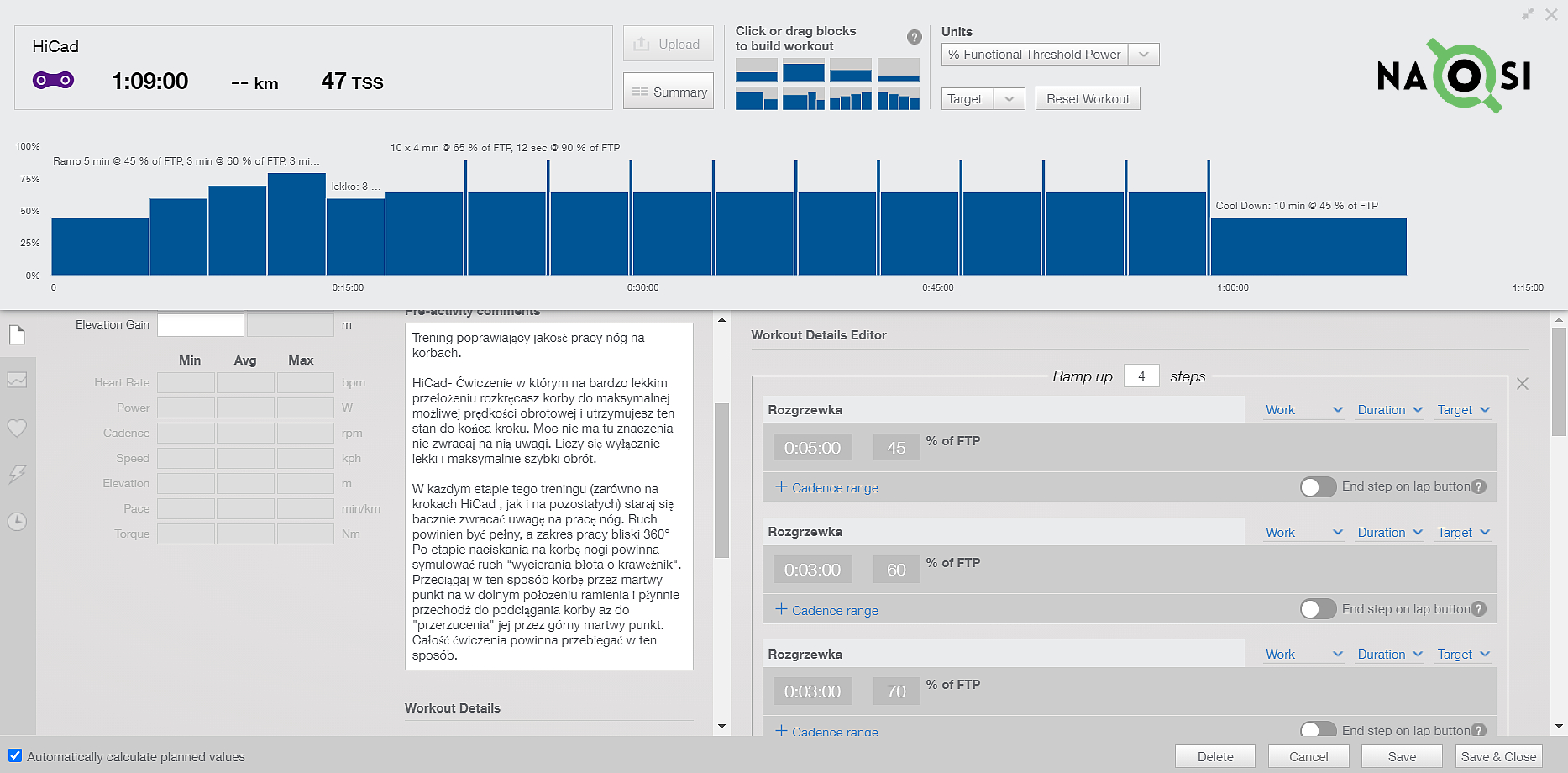 Po rozgrzewce, w odstępach 4 minutowych wplećcie dwunastosekundowe powtórzenia z minimalną mocą i maksymalną możliwą kadencją. Przełożenie powinno być bardzo lekkie (wszystkie biegi w lewo). Przez pierwsze 3-4 sekundy należy rozkręcać korby do maksymalnej możliwej prędkości obrotowej, a następnie starać utrzymać się obrót do końca kroku.