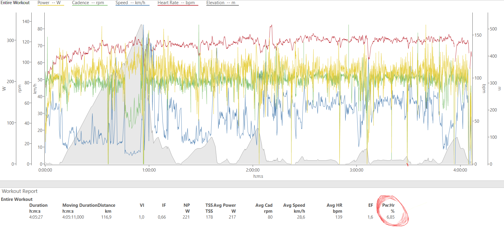 W trakcie jazdy wytrzymałościowej przy utrzymaniu stałych wartości mocy, dajmy na to 60-75% FTP, Twoje tętno może powoli rosnąć. Często pierwsza godzina jazdy generuje średnie tętno o wartości „X”, natomiast ostatnia godzina daje „X” + 5-10 uderzeń na minutę. Oznacza to, że do utrzymania stałej mocy Twój organizm musiał podnieść tętno o te 5-10 uderzeń. Po treningu należy sprawdzić, jaka jest wartość dryfu (Pw:Hr). Jeśli przekracza 5% najczęściej jest to informacją, że należy kontynuować treningi wytrzymałości tlenowej. Z tym, że warto pamiętać o bazowaniu na trendach, a nie na pojedynczych jednostkach.